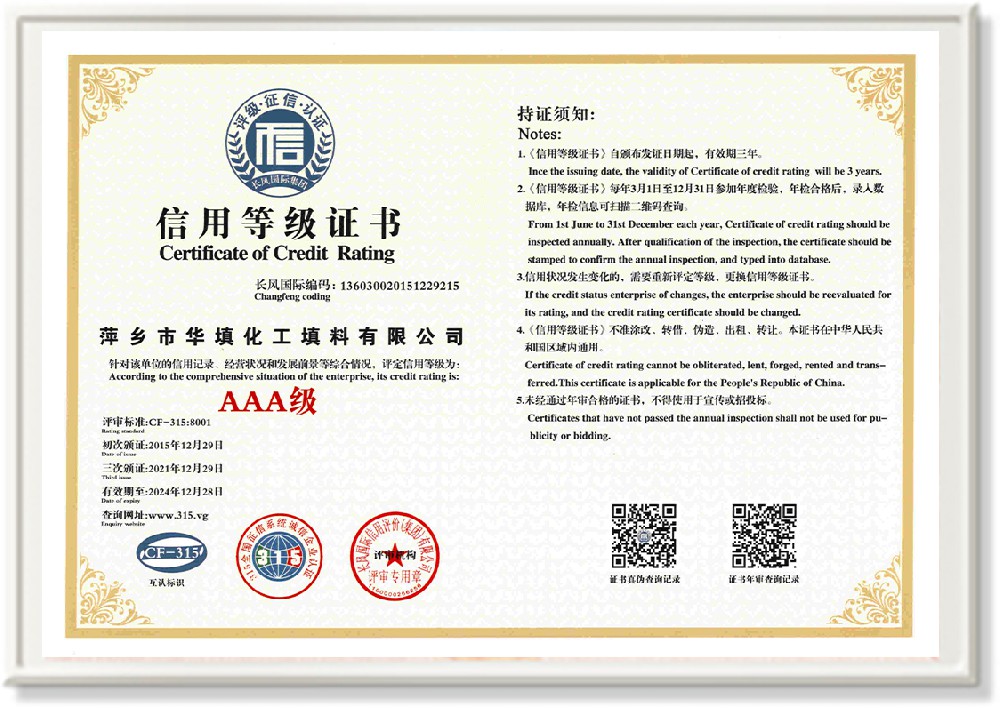 萍鄉市華填化工填料有限公司,位于320國道、109國道、浙贛鐵路、昌金高速公路貫穿其中,交通便利,是江西西部一顆燦爛明珠,創建于20世紀70年代初期,是中國石油天然氣股份有限公司“能源一號網”會員企業、中國石化物資采購電子商務網絡和中國海洋石油總公司采辦業務系統成員單位,是上海大學江西材料基因組工程產業研究院工業陶瓷產業創新聯盟基地,且通過ISO9001:2015質量管理體系、ISO14001:2015環境管理體系、ISO45001:2018職業健康安全管理體系認證的化工填料生產企業。公司擁有陶瓷、塑料、金屬填料、催化劑、活性氧化鋁、分子篩等產品生產線,現有固定資產3616萬元,占地面積3.8萬平方米。公司具有悠久的生產歷史、雄厚的技術力量和先進的生產工藝設備,可生產工業瓷球(支撐劑)、陶瓷、金屬、塑料質的規整、散堆化工填料及分子篩、催化劑、生化濾料、活性氧化鋁、石化助劑、活性炭、環保材料、耐火材料等系列的200多種規格型號產品。
